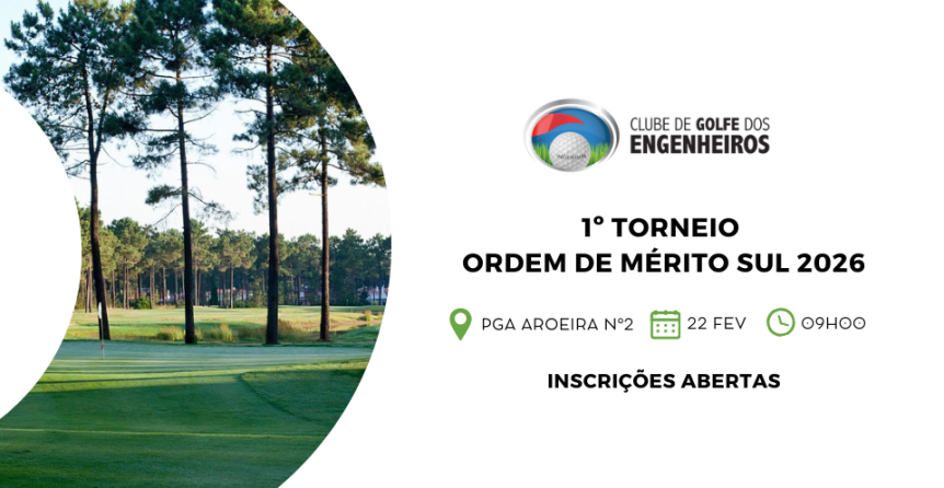 O Clube de Golfe dos Engenheiros irá realizar o 1º Torneio da Ordem de Mérito Sul 2026 no próximo dia 22 de Fevereiro (Domingo), no campo PGA Aroeira Nº2, em formato de shotgun a partir das 9H00.